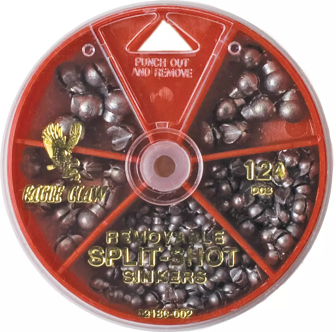 Add variety to your tackle box with Eagle Claw's® Removable Split Shot Sinker Assortment. This pack contains a number of different split shots for whatever your fishing situation requires. With a total of 124 pieces, Eagle Claw has covered all the bases for your next freshwater or saltwater fishing excursion.